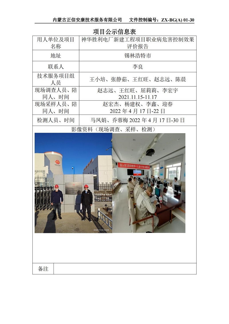 神華勝利電廠新建工程項(xiàng)目職業(yè)病危害控制效果評價報告公示信息表