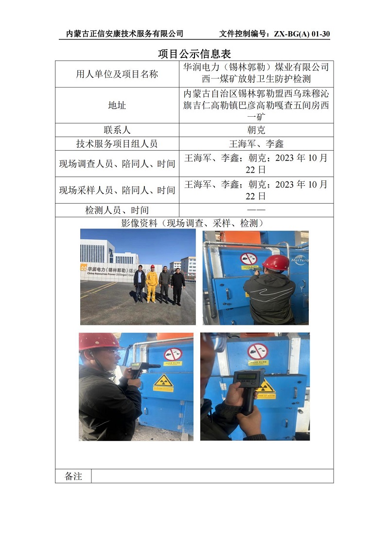 華潤電力(錫林郭勒)煤業(yè)有限公司西一煤礦放射衛(wèi)生防護檢測