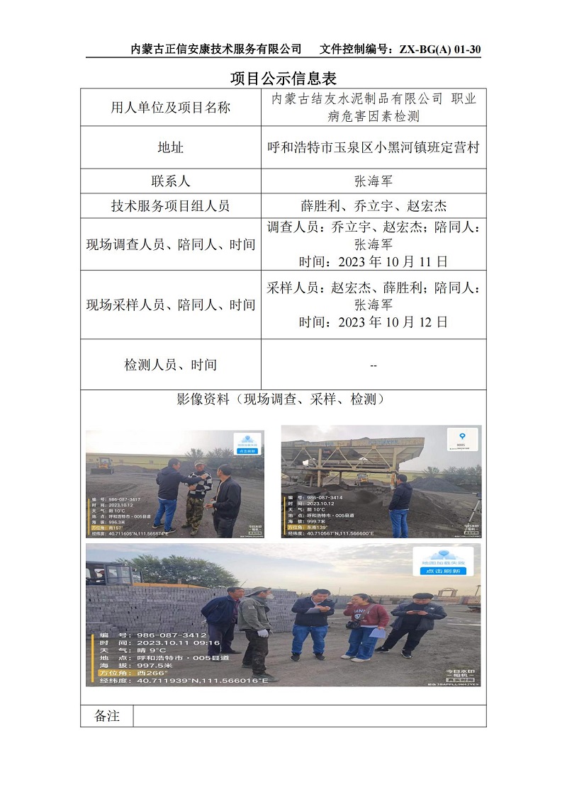 內(nèi)蒙古結(jié)友水泥制品有限公司 職業(yè)病危害因素檢測項(xiàng)目公示信息表