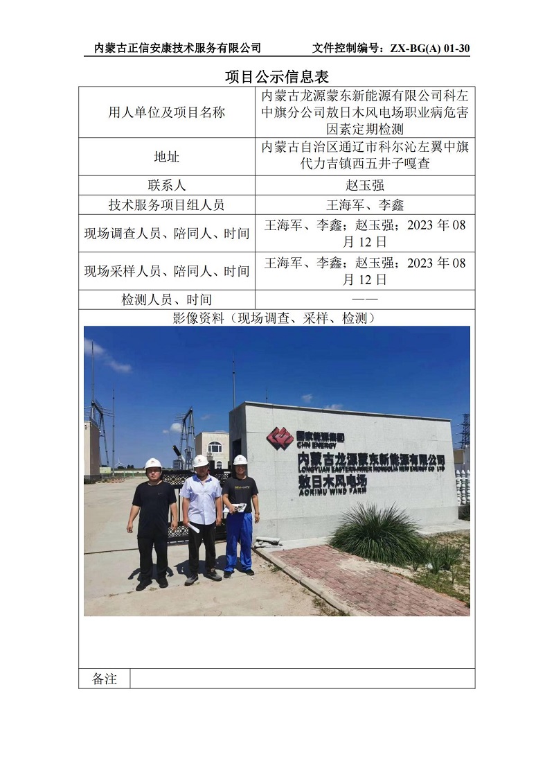 內(nèi)蒙古龍源蒙東新能源有限公司科左中旗分公司敖日木風(fēng)電場職業(yè)病危害因素定期檢測