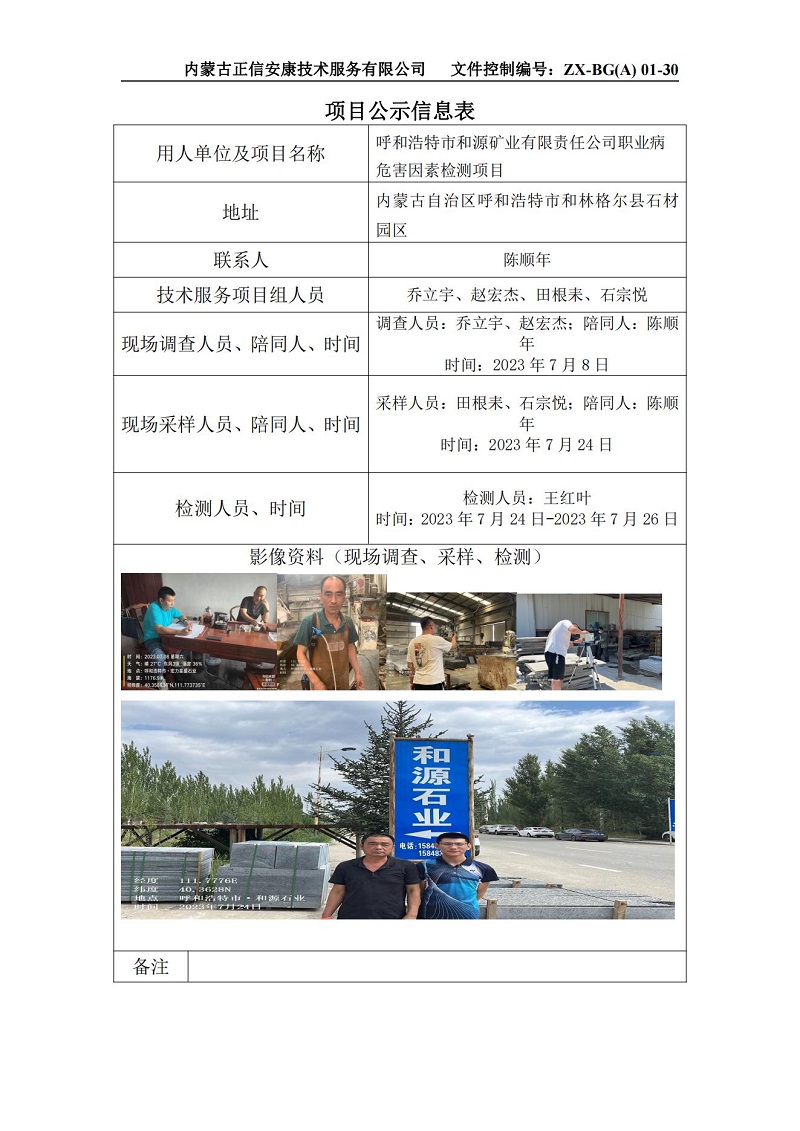呼和浩特市和源礦業(yè)有限責(zé)任公司職業(yè)病危害因素檢測項目公示信息表