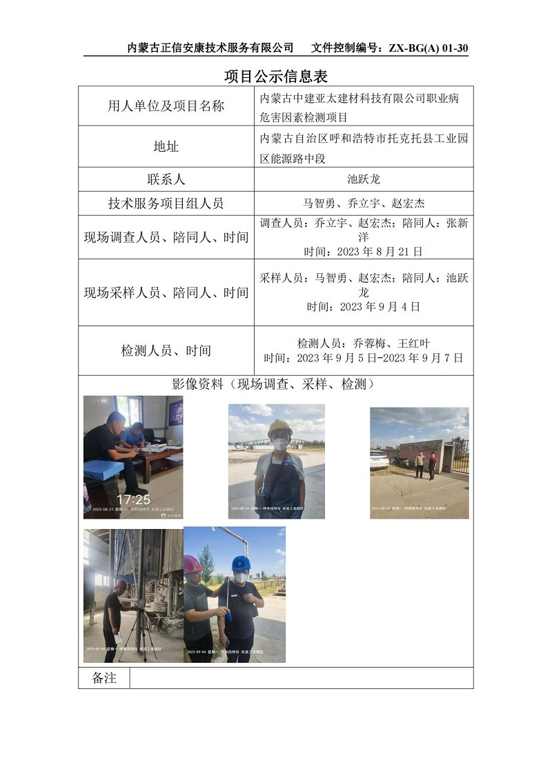 內蒙古中建亞太建材科技有限公司職業(yè)病危害因素檢測項目公示信息表_