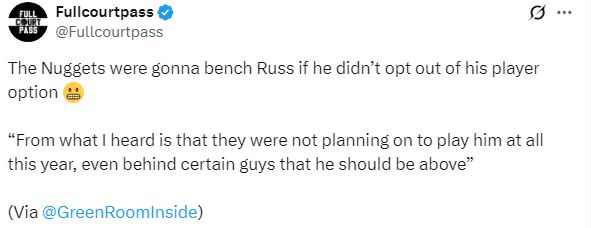 究竟威少為什么選擇跳出合同?前NBA球員丹尼-格林在節(jié)目中透露,威少?zèng)Q定拒絕球員選項(xiàng)的原因是,掘金方面并沒有打算讓他進(jìn)入輪換陣容,而是準(zhǔn)備讓他長(zhǎng)期坐在板凳末端;消息人士稱:據(jù)我所知,他們(掘金)今年根本沒打算讓他上場(chǎng),甚至要把他排在某些本應(yīng)在他之下的球員后面。