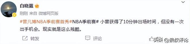 籃球記者賈磊發(fā)文點評:我說實話,這球看的真是有點生氣,就給二四節(jié)最后3分鐘,而且隊友完全不傳球,看都不看,大部分時間小曾都在底角抽煙,一點戰(zhàn)術(shù)機會都不給。如果不是打了個加時賽,估計還沒出汗比賽就結(jié)束了。