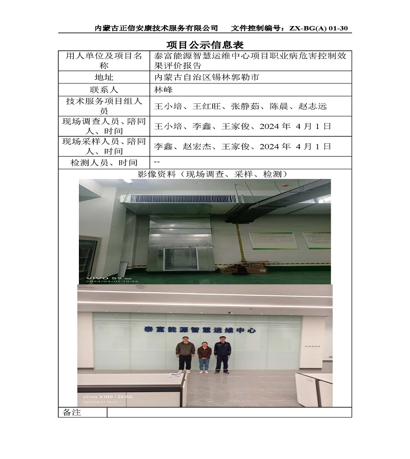 泰富能源智慧運(yùn)維中心項目職業(yè)病危害控制效果評價