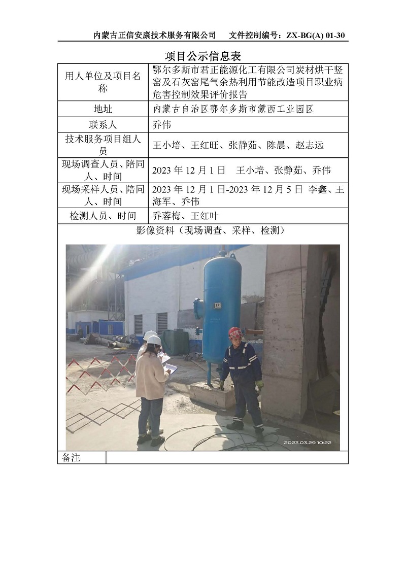 鄂爾多斯市君正能源化工有限公司炭材烘干豎窯及石灰窯尾氣余熱利用節(jié)能改造項目職業(yè)病危害控制效果評價
