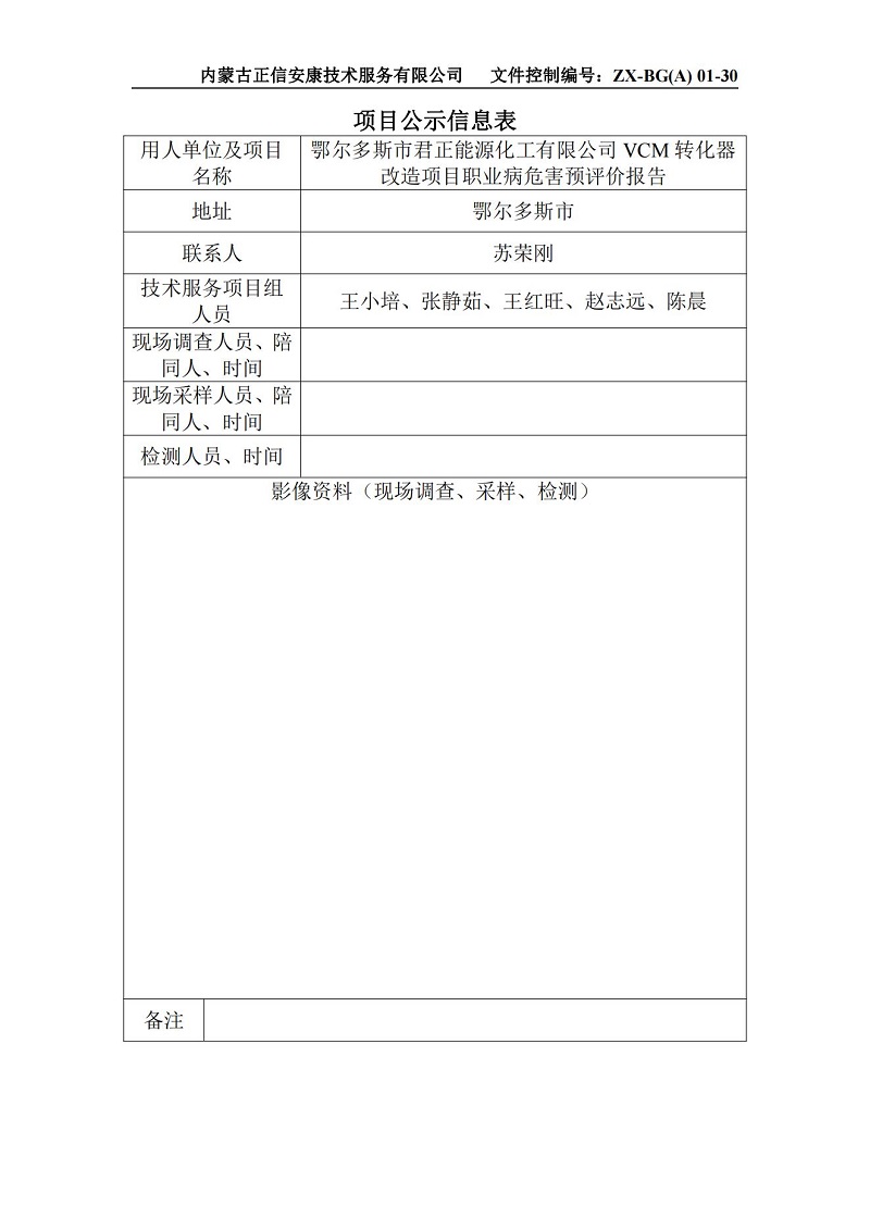 鄂爾多斯市君正能源化工有限公司VCM轉(zhuǎn)化器改造項目職業(yè)病危害預評價報告公示信息表