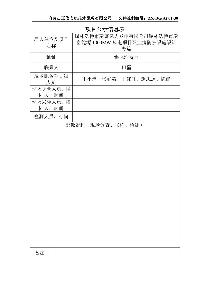 錫林浩特市泰富風(fēng)力發(fā)電有限公司錫林浩特市泰富能源1000MW風(fēng)電項(xiàng)目職業(yè)病防護(hù)設(shè)施設(shè)計(jì)專(zhuān)篇公示信息表