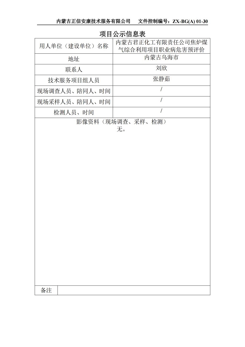 內(nèi)蒙古君正化工有限責(zé)任公司焦?fàn)t煤氣綜合利用項(xiàng)目職業(yè)病危害預(yù)評(píng)價(jià)