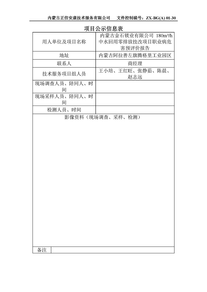 內(nèi)蒙古金石鎂業(yè)有限公司 180m3h中水回用零排放技改項(xiàng)目職業(yè)病危害預(yù)評價報告信息公示表