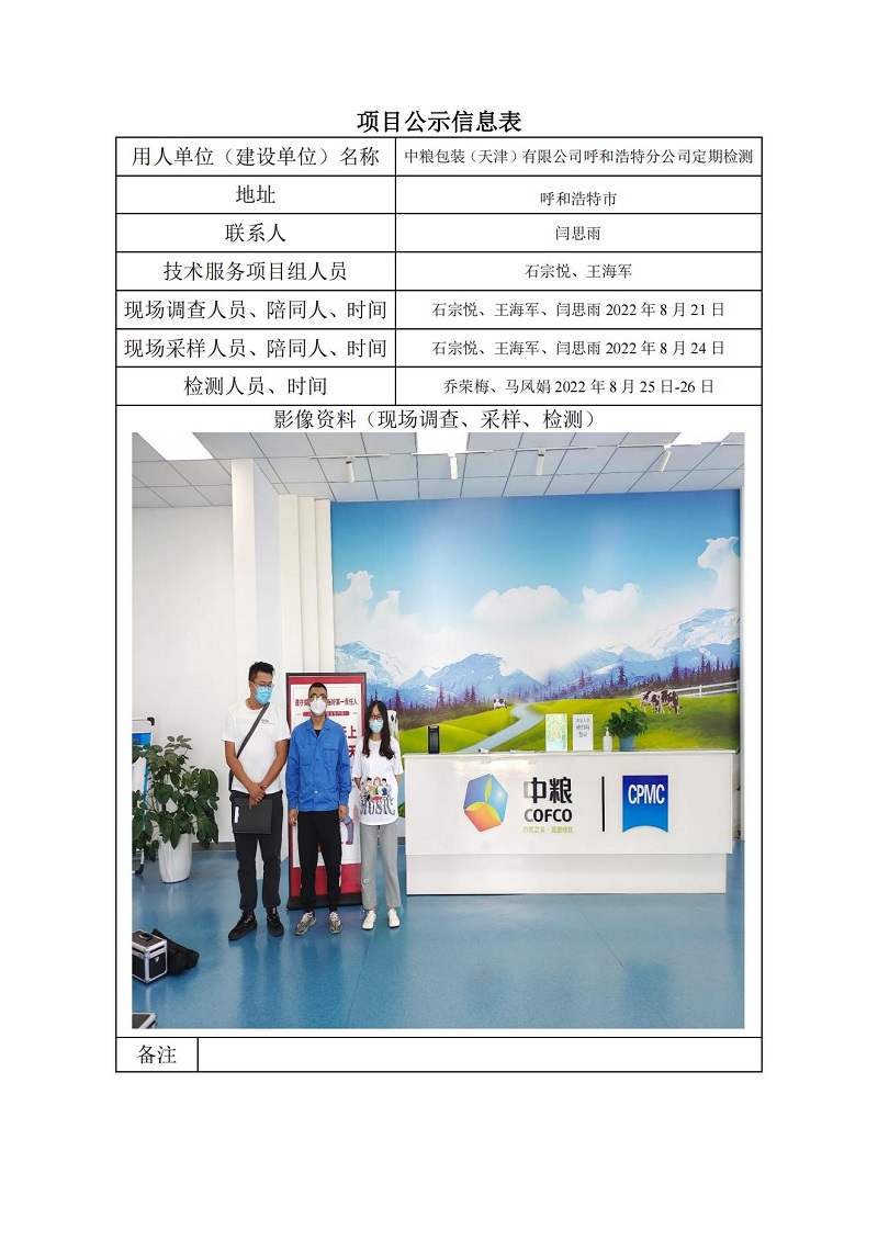 中糧包裝(天津)有限公司呼和浩特分公司定期檢測項(xiàng)目公示信息表