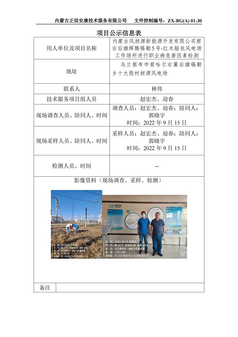 內(nèi)蒙古風(fēng)昶源新能源開發(fā)有限公司察右后旗輝騰錫勒5號-紅木腦包風(fēng)電場工作場所進行職業(yè)病危害因素定期檢測