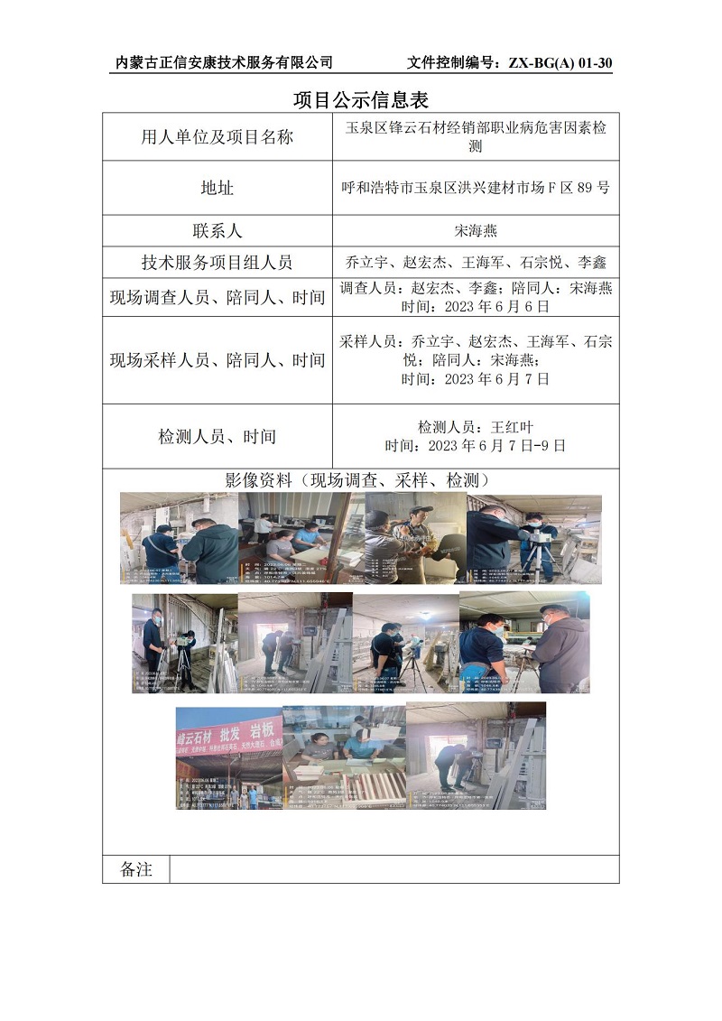 玉泉區(qū)鋒云石材經(jīng)銷部職業(yè)病危害因素檢測(cè)