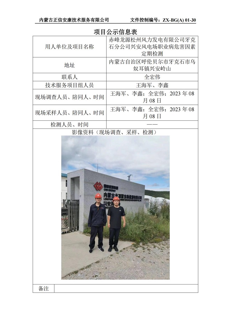 赤峰龍源松州風(fēng)力發(fā)電有限公司牙克石分公司興安風(fēng)電場職業(yè)病危害因素定期檢測_