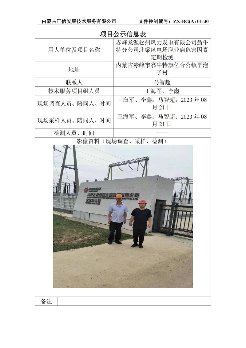 赤峰龍?jiān)此芍蒿L(fēng)力發(fā)電有限公司翁牛特分公司北梁風(fēng)電場職業(yè)病危害因素定期檢測