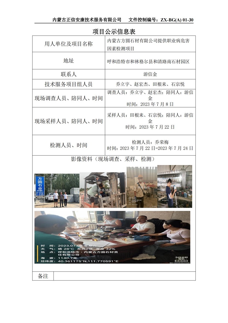 內(nèi)蒙古方圓石材有限公司職業(yè)病危害因素檢測項目公示信息表