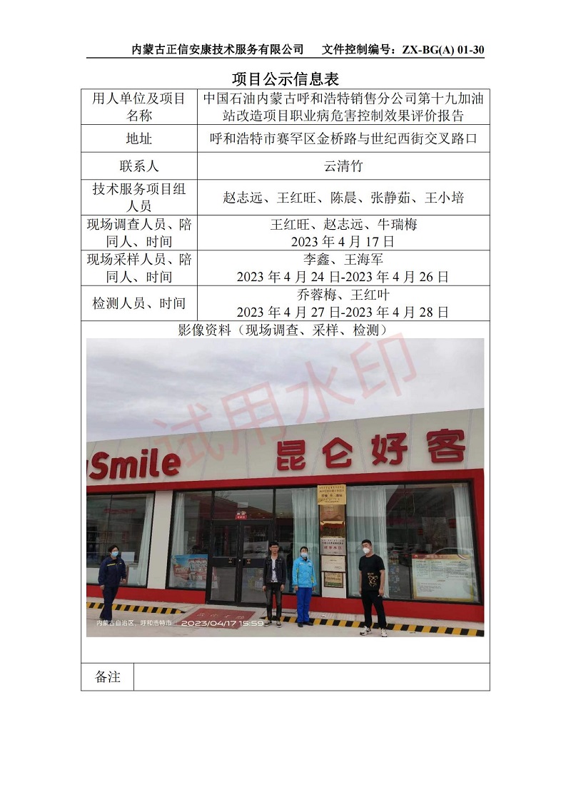 中國石油內(nèi)蒙古呼和浩特銷售分公司第十九加油站改造項目職業(yè)病危害控制效果評價報告-項目公示信息表