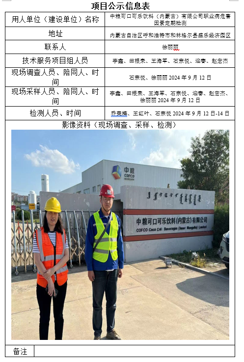 中糧可口可樂飲料(內蒙古)有限公司職業(yè)病危者因素定期檢測