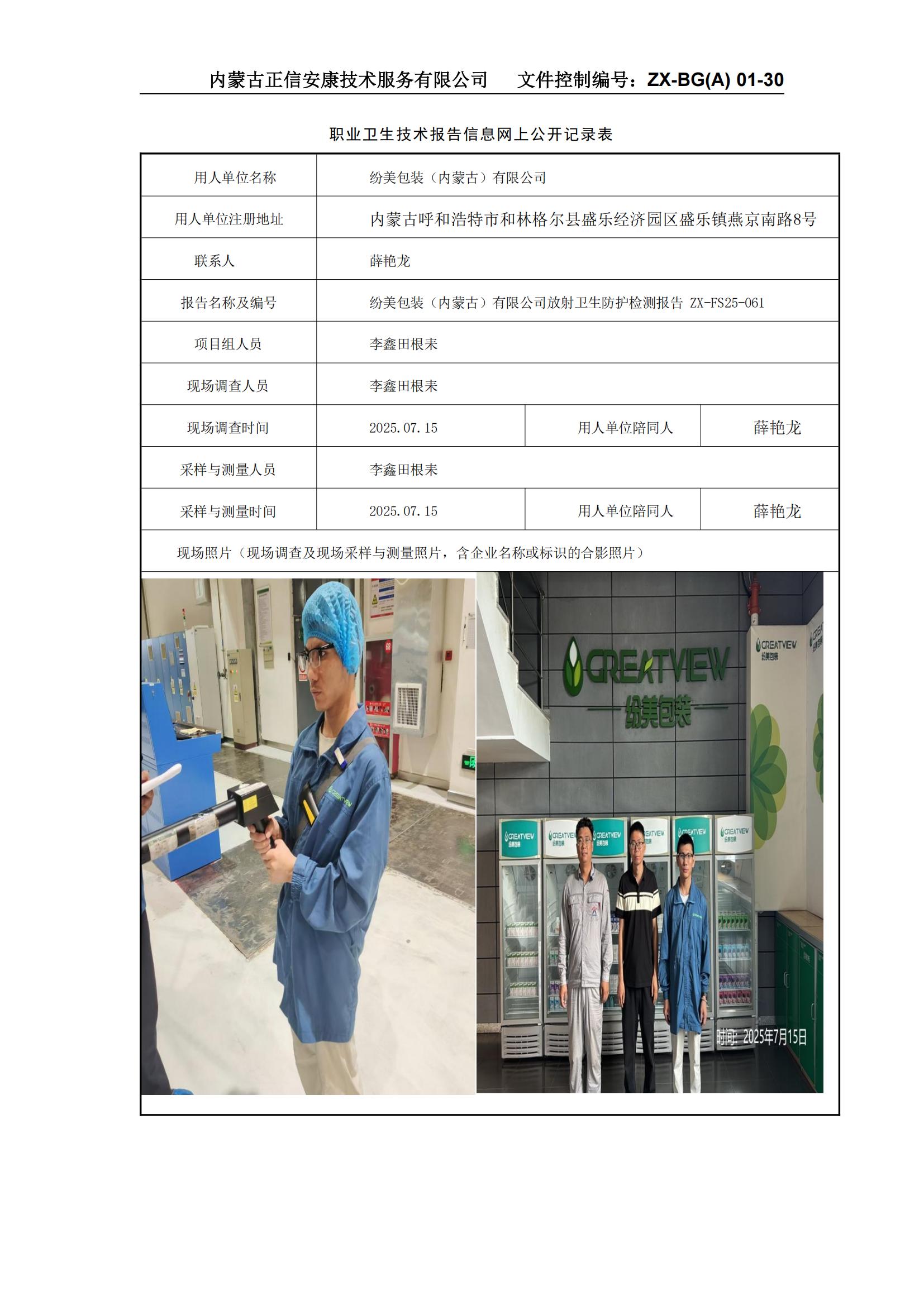 紛美包裝(內(nèi)蒙古)有限公司放射衛(wèi)生防護(hù)檢測